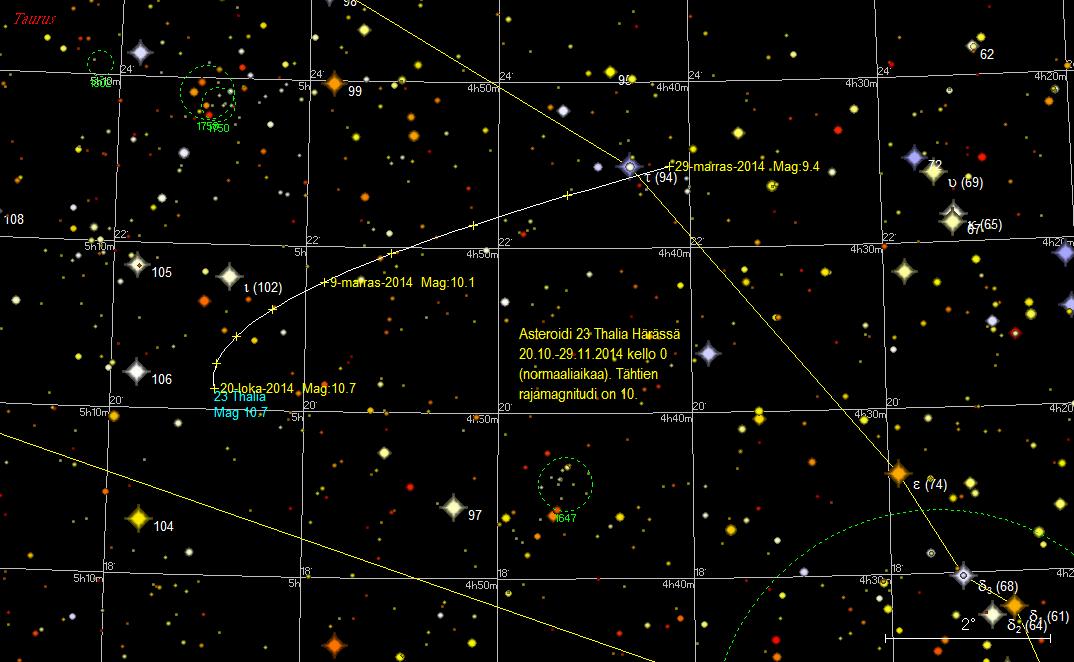 Asteroidi 23 Thalia on 20. lokakuuta 7,5 astetta itäkoilliseen Aldebaranista. Iota Tauri -tähdestä
