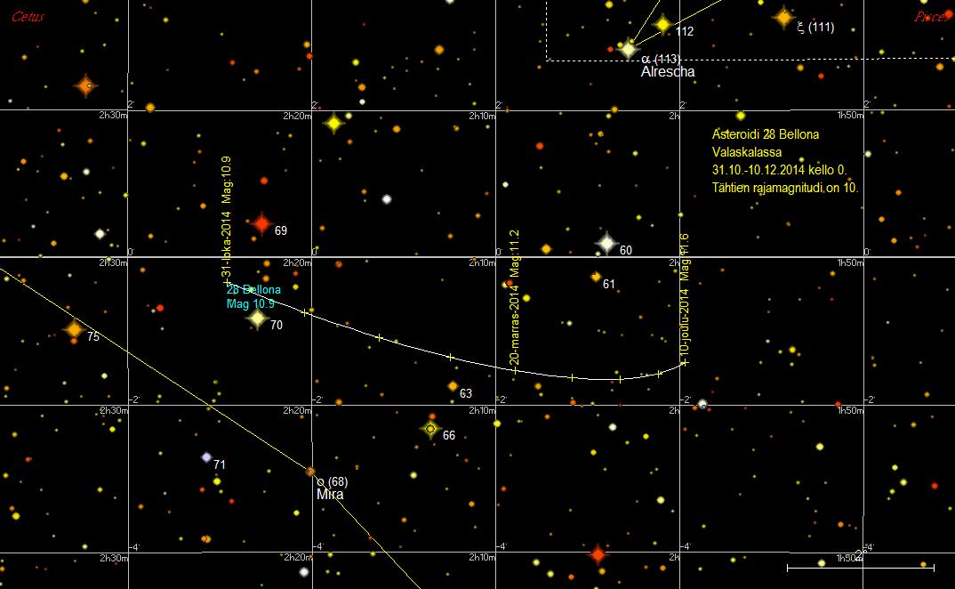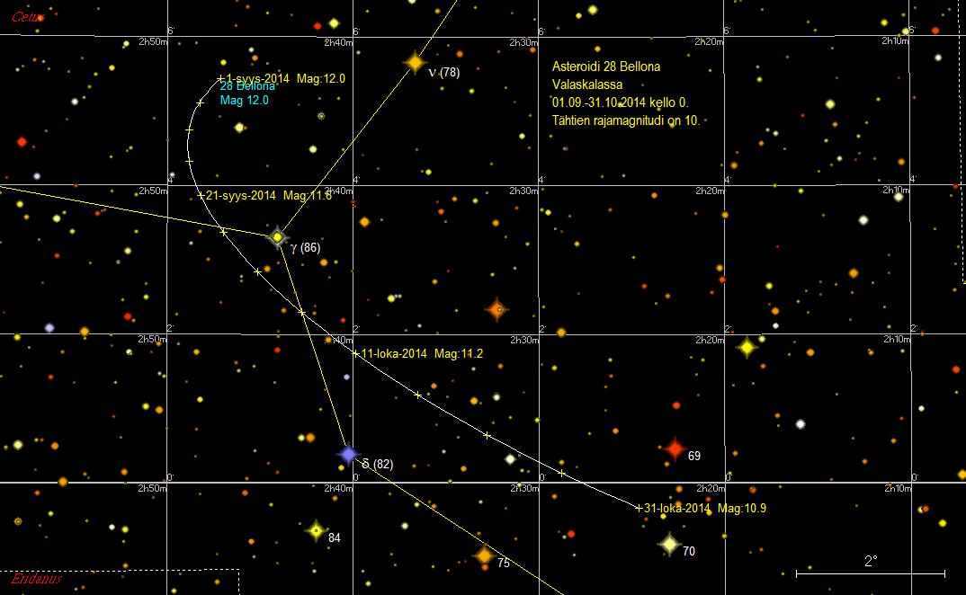 Asteroidi 28 Bellona on lokakuun alussa puoli astetta kaakkoon Valaskalan Gamma -tähdestä (3,54 mag).