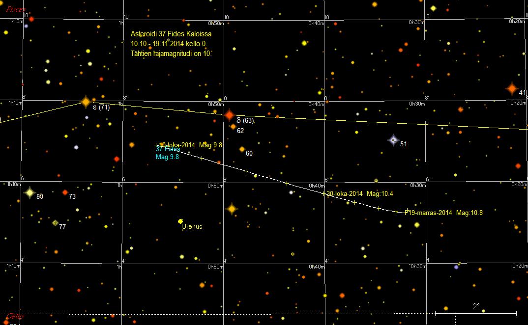 Asteroidi ohittaa 13./14. lokakuuta luoteen puolelta 1,2 asteen etäisyydeltä Delta Ceti -tähden