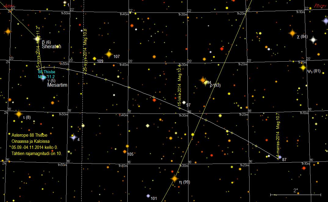 50 astetta. Thisbe ohittaa 26./27. syyskuuta etelän puolelta 0,7 asteen etäisyydeltä 109