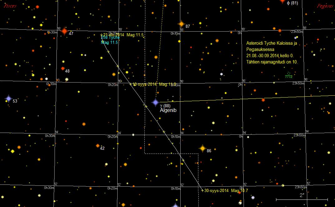 Tyche ohittaa 14./15. syyskuuta idän puolelta Algenibin 0,4 asteen etäisyydeltä. Asteroidi