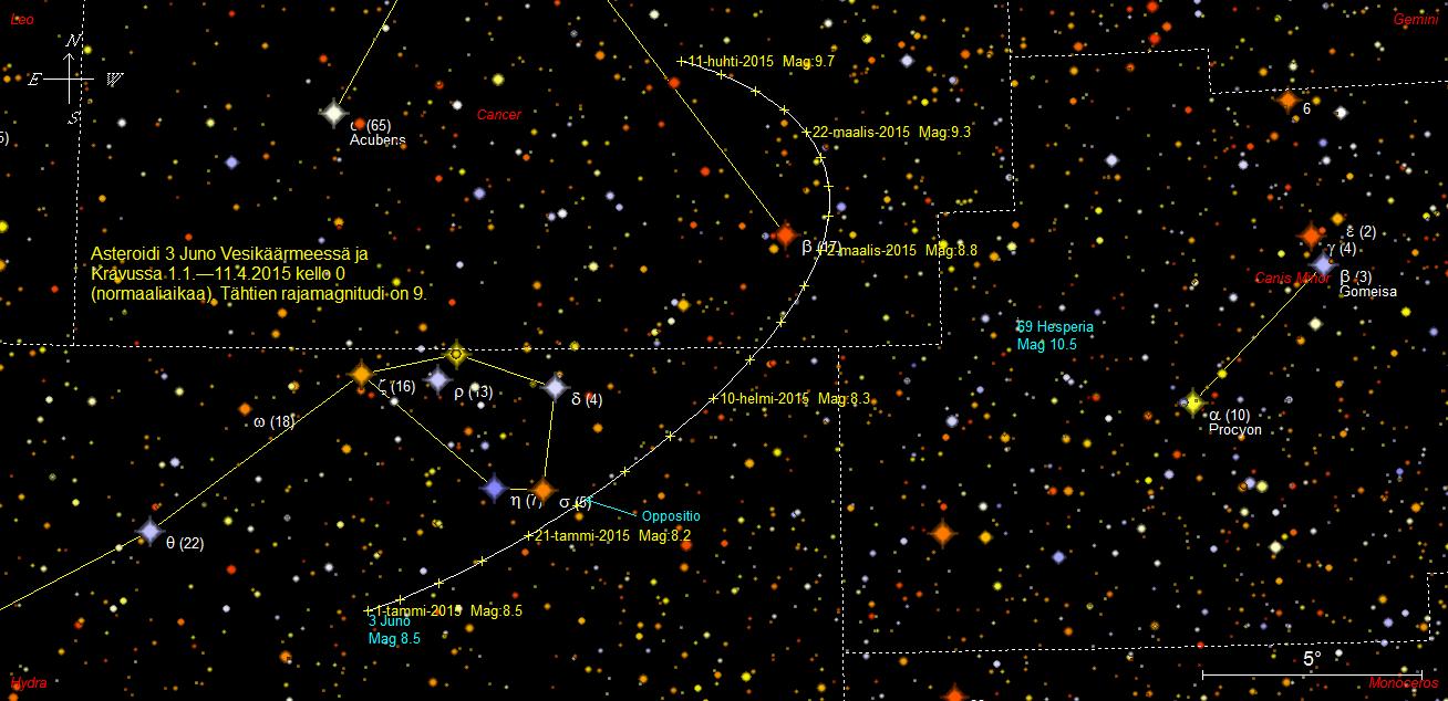 Asteroidi 3 Juno on tammikuun alussa viisi astetta etelään Tseta Hydri -tähdestä