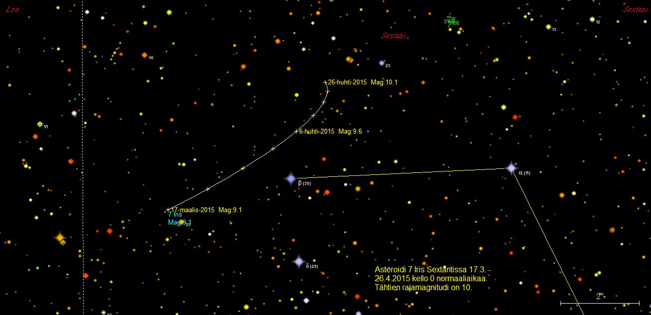 ohittaa 30./31. maaliskuuta koillisen puolelta Beeta Sextantis -tähden (5,00-5,10 mag). Iriksen