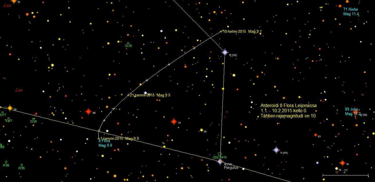 Asteroidi 8 Flora on tammikuun alussa 5,5 astetta itäkoilliseen Reguluksesta. Asteroidin liike