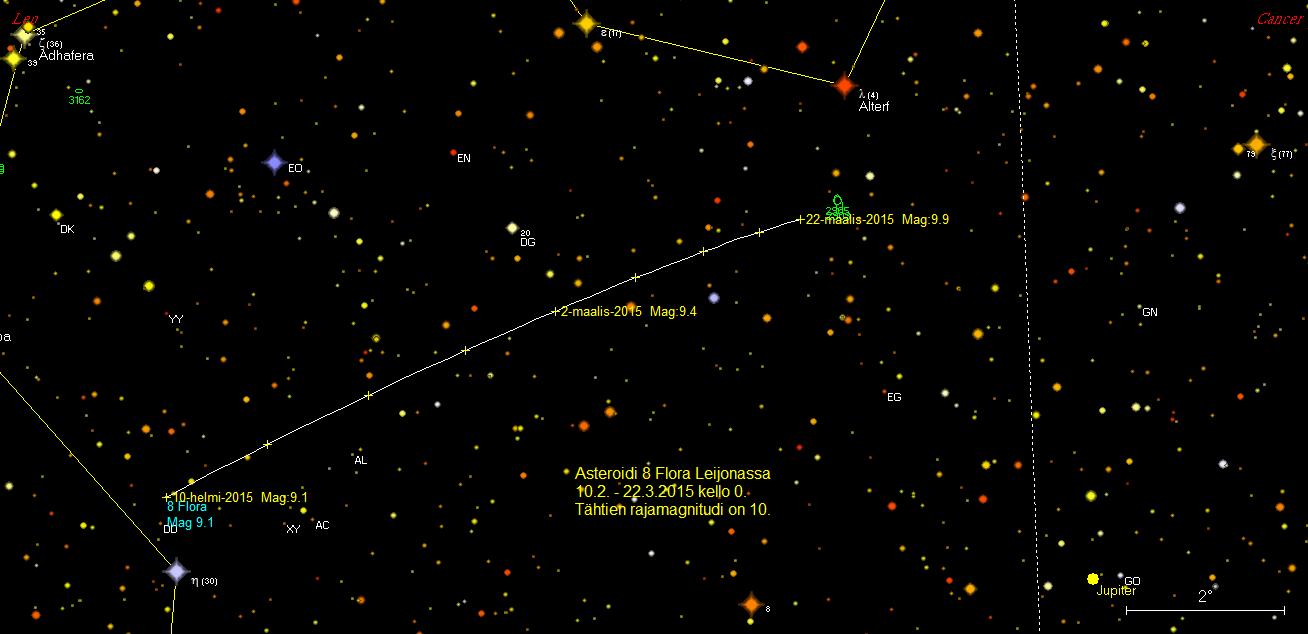 Eetta Leonis -tähden (3,49 mag) 0,9 asteen ettäisyydeltä. Floran liike muuttuu