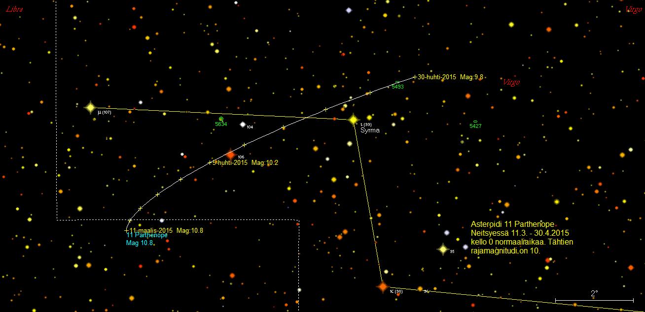 Asteroidi 11 Parthenope on maaliskuun alussa neljä astetta eteläkaakkoon Myy Virginis