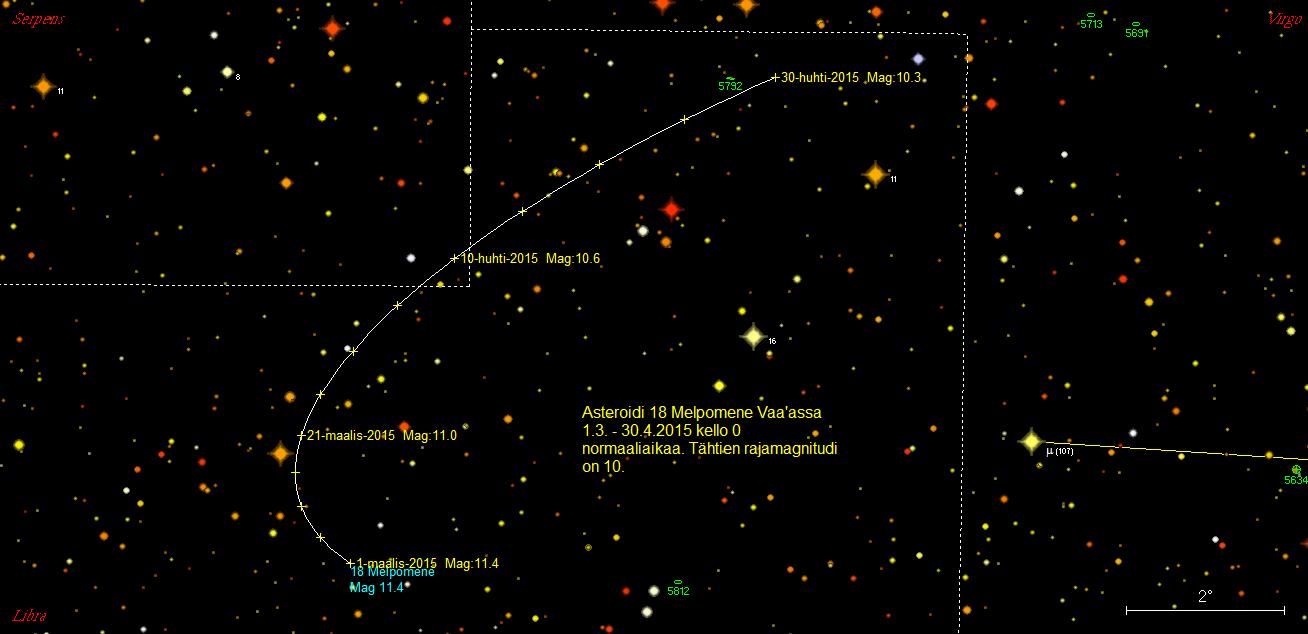 Librae, 2,57 mag). Asteroidin liike muuttuu taantuvaksi 15. maaliskuuta. Melpomene ei ohita läheltä