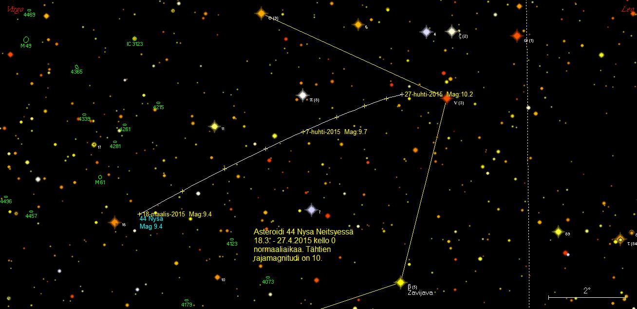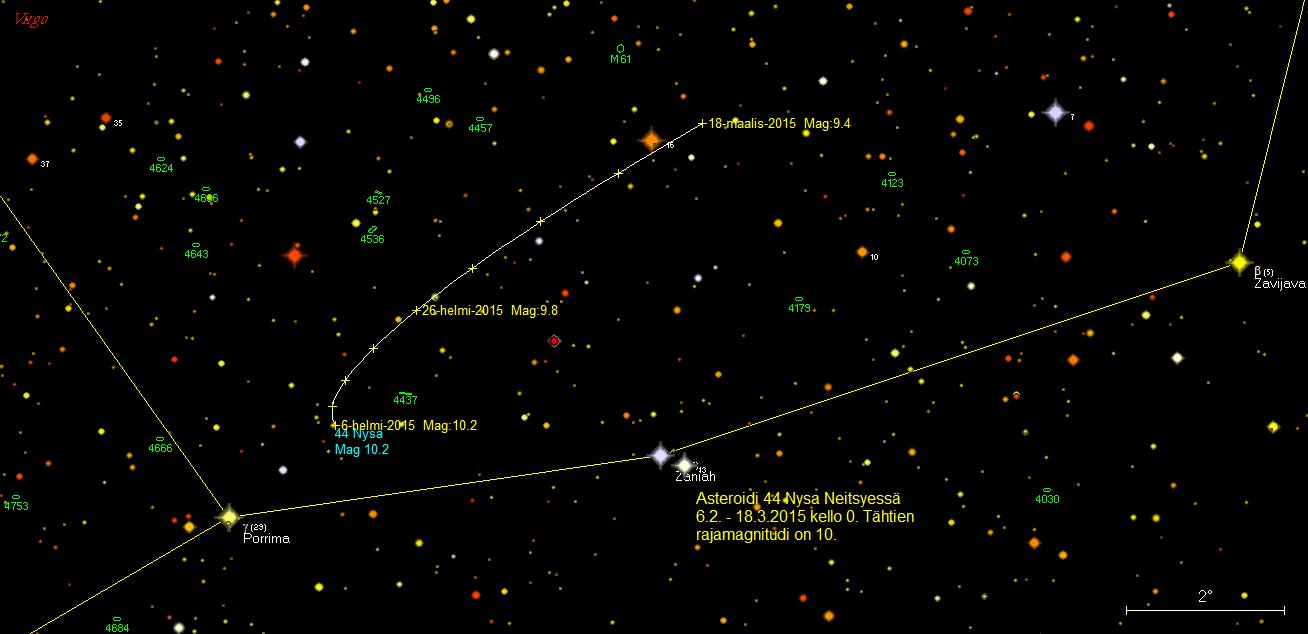 Asteroidi 44 Nysa on helmikuun alussa kaksi astetta luoteeseen Porrimasta (Gamma Virginis, 3,45 mag).