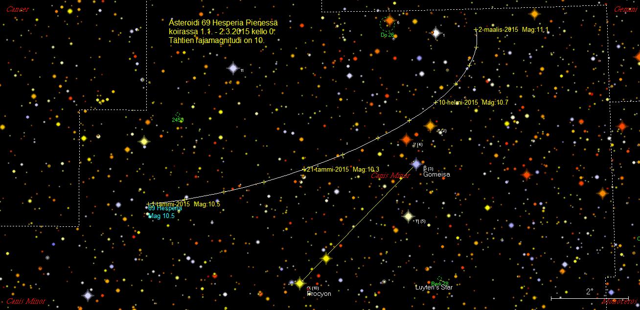 Asteroidi 69 Hesperia on tammikuun alussa 4,5 astetta koilliseen Procyonista (Alfa Canis Minoris,