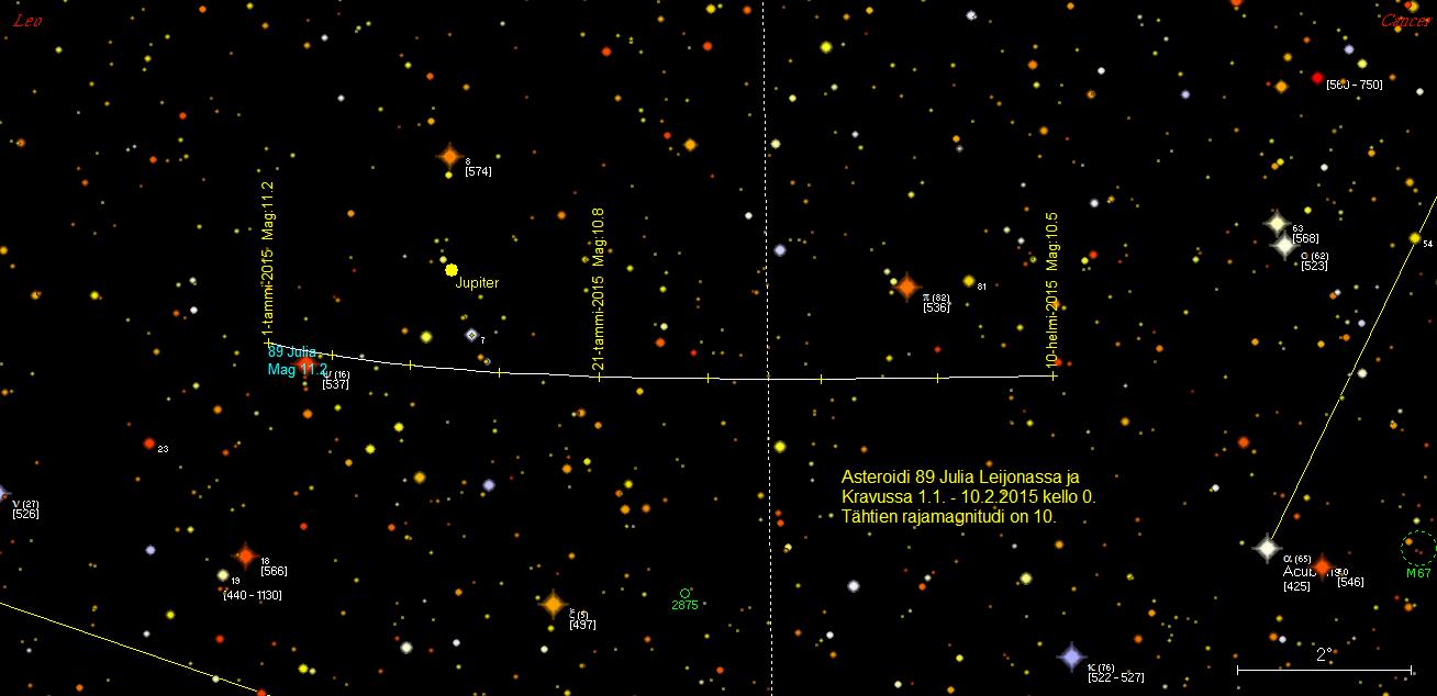 Asteroidi on samaan aikaan kaksi astetta itäkaakkoon Jupiterista. Julia ohittaa 3./4. tammikuuta