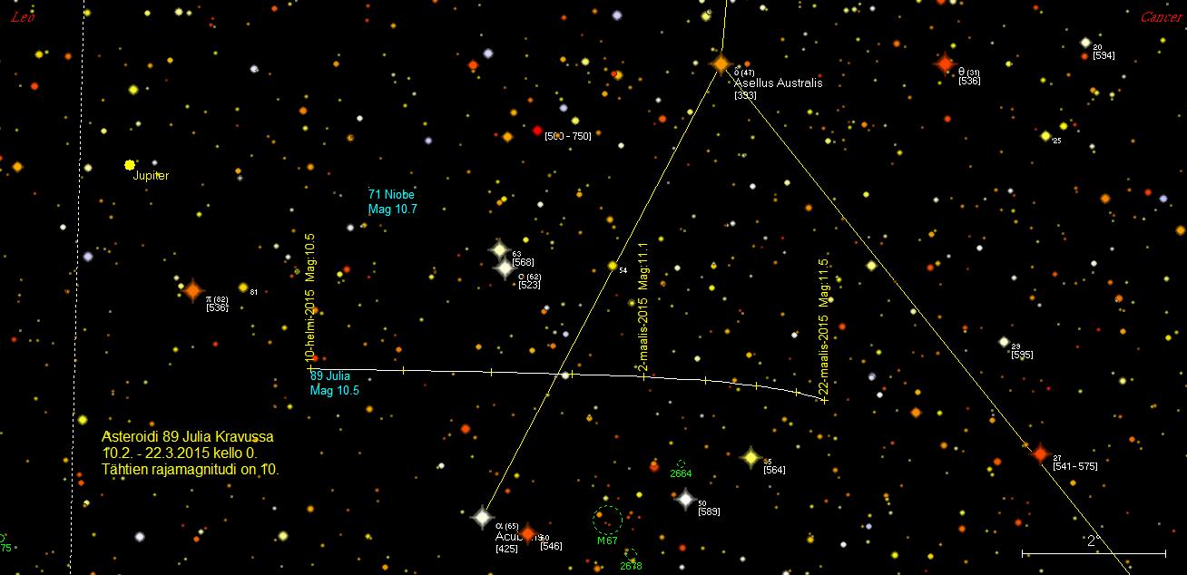 | 89 Julia | 12.12.2014 | 05.02.2015 | 10,4 | 01.04.2015 | Leo, Cancer |