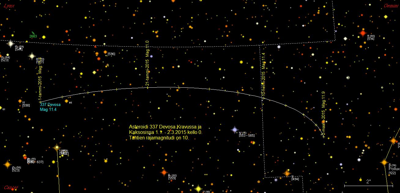 Asteroidi 337 Devosa on tammikuun alussa kaksi astetta pohjoiseen Iota Cancri -tähdestä (4,02 mag).