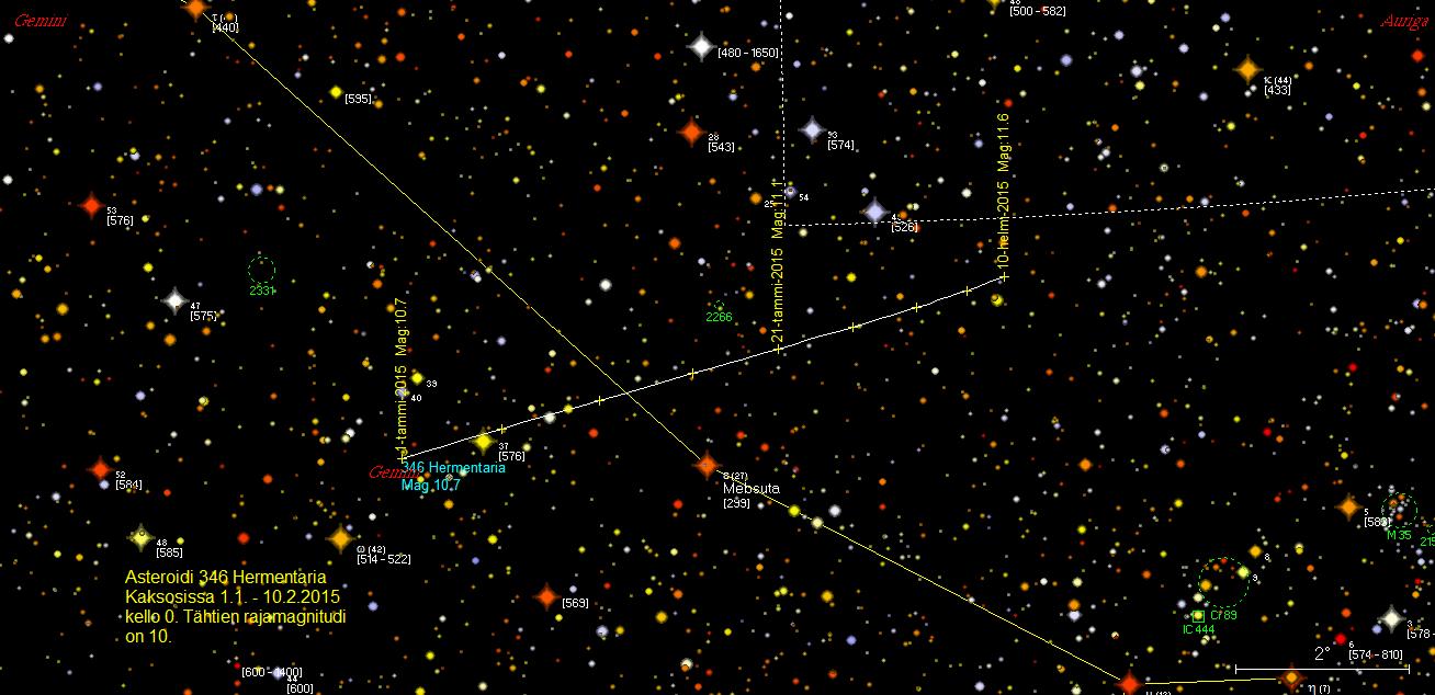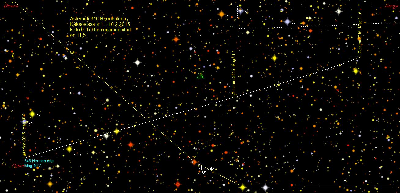 Asteroidi 346 Hermentaria on tammikuun alussa 3,5 astetta itään Mebsutasta (Epsilon Geminorum, 2,99 mag).