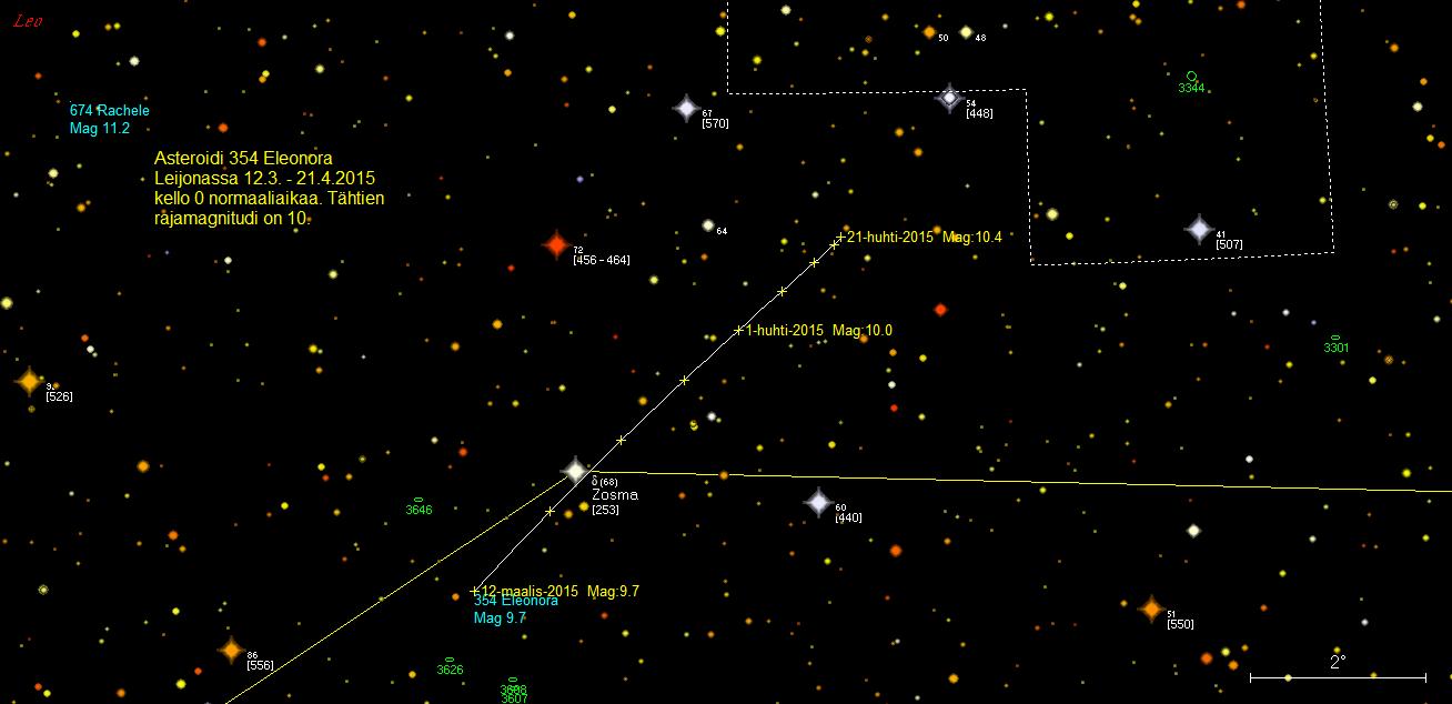 85 Leonis -tähden 0,2 asteen etäisyydeltä. Eleonora ohittaa 27./28. helmikuuta idän puolelta