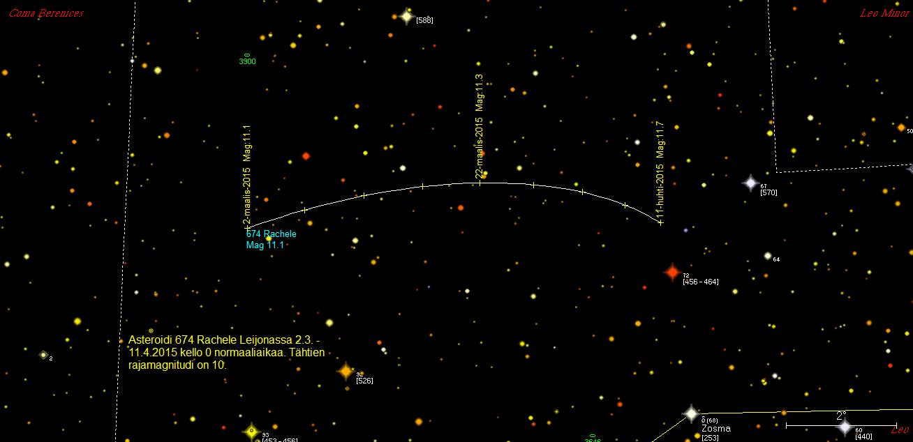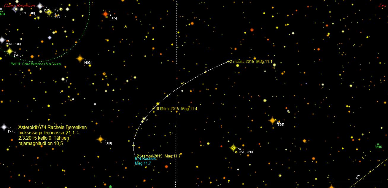 Asteroidin 674 Rachele on tammikuun alussa 4,5 astetta pohjoiskoilliseen Denebolasta (Beetta Leonis,