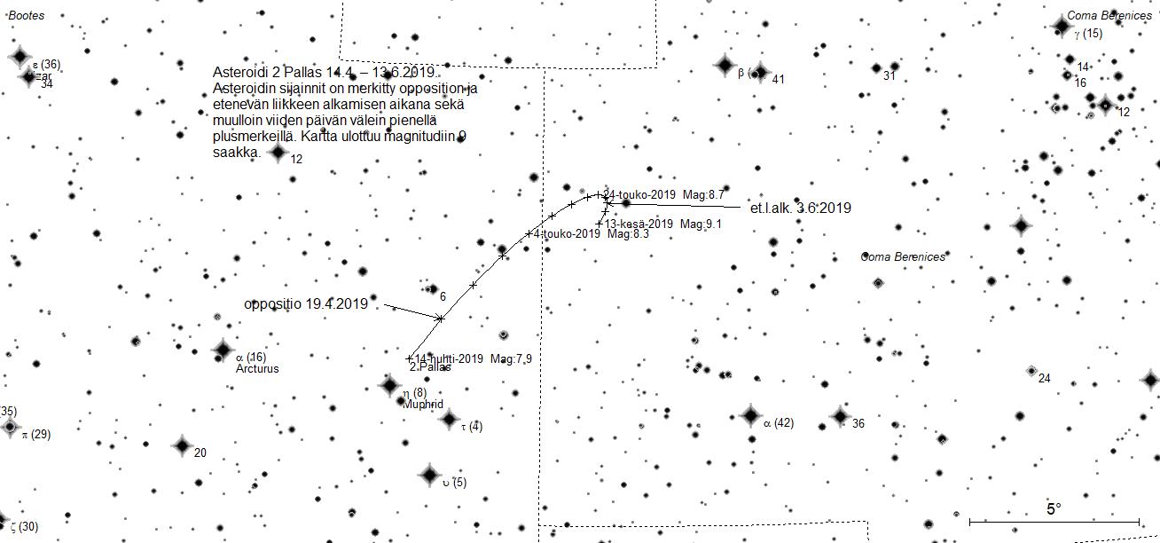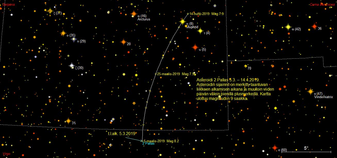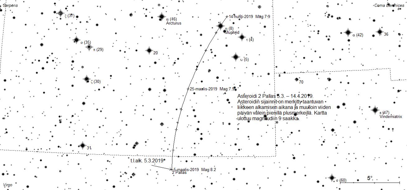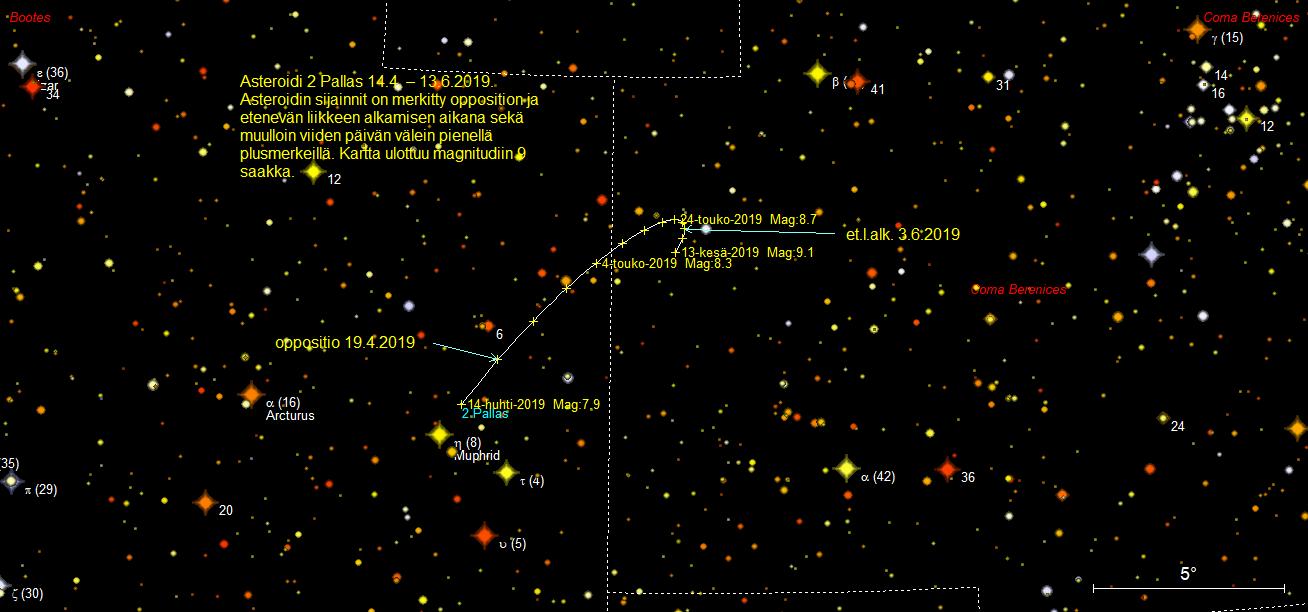 Asteroidi 2 Pallas on maaliskuun alussa neljä astetta koilliseen Neitsyen τ Virginis -tähdestä. Pallas aloittaa 5.3. taantuvan liikkeensä ja se on oppositiossa 19.4.2019 sekä aloittaa etenevän liikkeensä 3.6.2019. Asteroidi siirtyy 8.3. Neitsyestä Karhunvartijaan ja 6.5. Karhunvartijasta Bereniken hiuksiin. Pallas ohittaa läheltä taulukossa mainitut paljain silmin näkyvät tähdet.