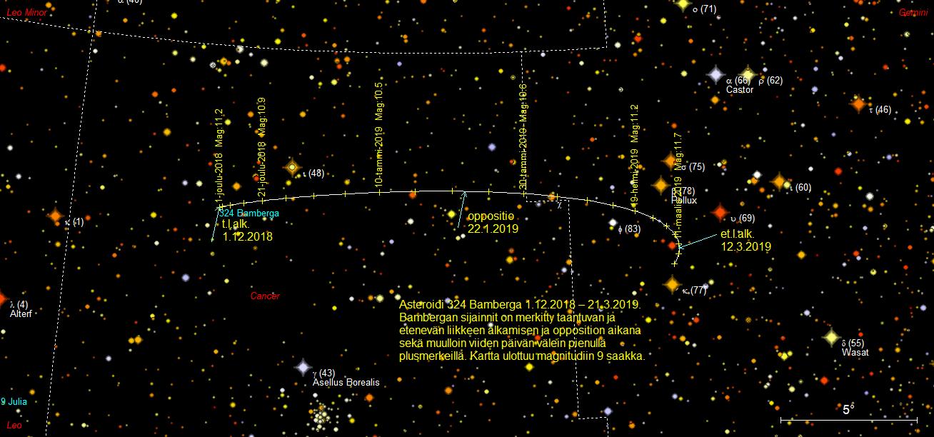 Asteroidi 324 Bamberga aloittaa taantuvan liikkensä 1.12.2018 lähes 7 astetta pohjoiskoilliseen Kravun γ Cancri (Asellus Borealis) -tähdestä. Bamberga on oppositiossa 22.1.2019 ja sen kirkkaus on tällöin 10,4 magnitudia. Asteroidi siirtyy 30.1.2019 Kravusta Kaksosiin ja aloittaa 12.3.2019 etenevän liikkeensä. Bamberga ohittaa läheltä taulukossa mainitut paljain silmin näkyvät tähdet.