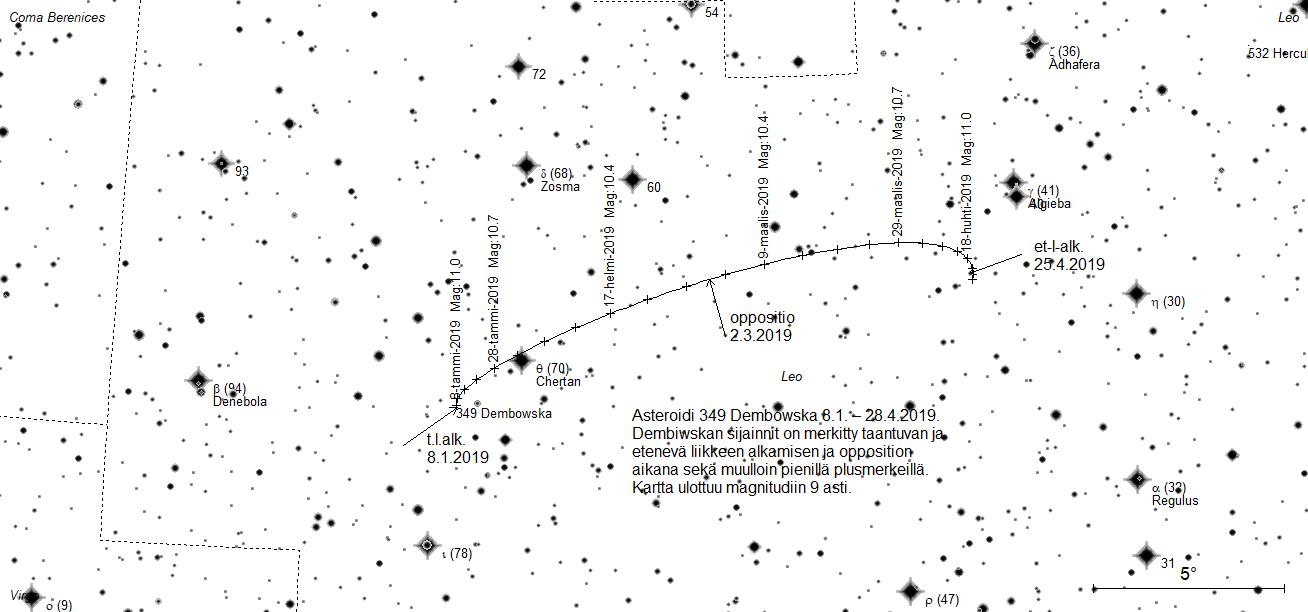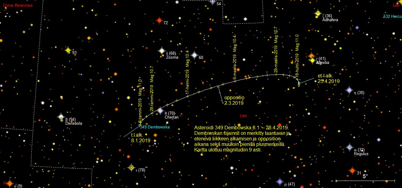 Asteroidi 349 Dembowska on tammikuun alussa kaksi astetta kaakkoon Leijonan Chertanista (θ Leonis). Dembowska aloittaa taantuvan liikkeensä 9.1.2019 ja se on oppositiossa se on 2.3.2019 sekä aloittaa 25.4.2019 etenevän liikkeensä. Dembowska ohittaa läheltä taulukossa mainitut paljain silmin näkyvät tähdet.