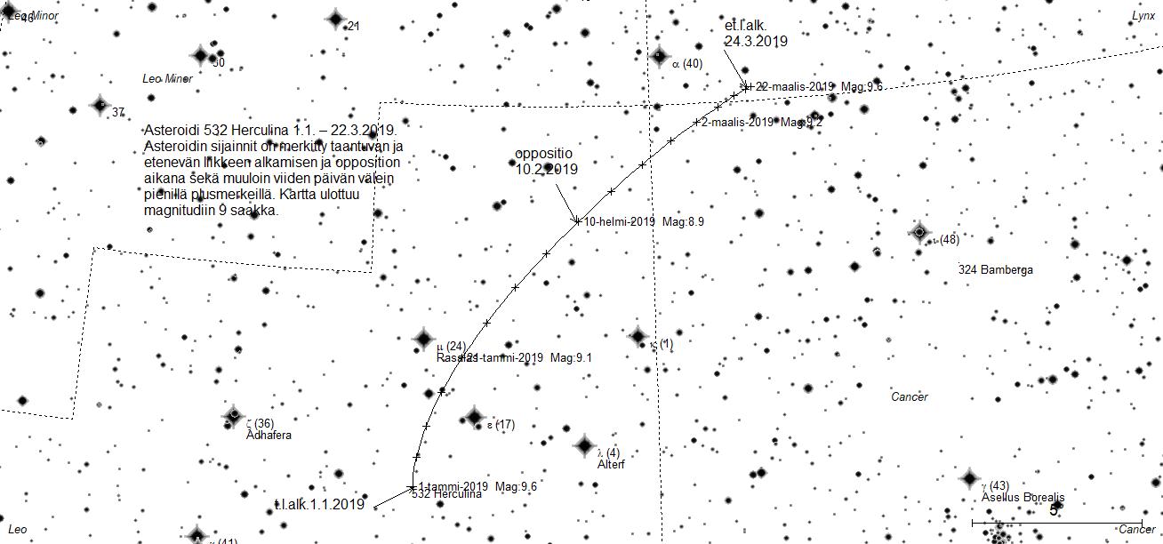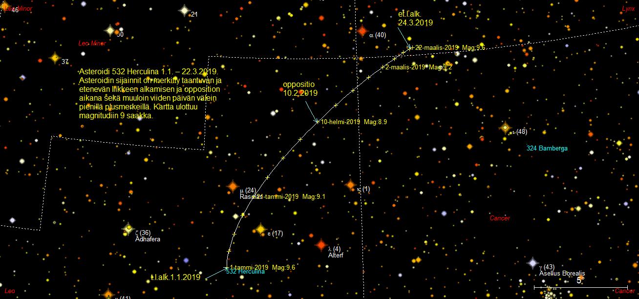 Asteroidi 532 Herculina on tammikuun alussa kuusi astetta länsiluoteeseen Leijonan Algiebasta (γ Leonis). Herculina liikkuu taivaalla nopeasti luoteeseen ja siirtyy maaliskuun puolivälissä toisen kissaeläimen, Ilveksen tähdistöön. Asteroidi aloittaa 1.1.2019 taantuvan liikkeensä ja on oppositiossa 10.2. magnitudin 8,9 kohteena sekä aloittaa 24.3. etenevän liikkeensä. Herculina on 18.1. μ (Rasalas) ja ε Leonis -tähtien välisellä viivalla. Asteroidi siirtyy 21.2. Leijonasta Krapuun ja 9.3. Kravusta Ilvekseen. Herculina ohittaa läheltä taulukossa mainitut paljain silmin näkyvät tähdet.