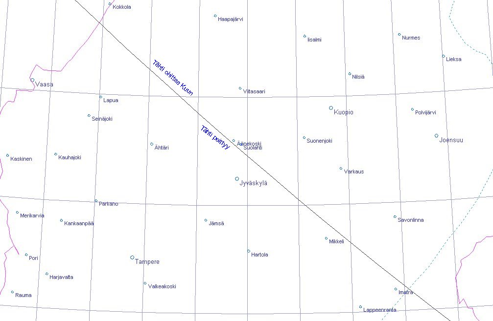 Imatran kautta kulkevan viivan kohdalla. Viivan pohjoispuolella tähti ohittaa Kuun.