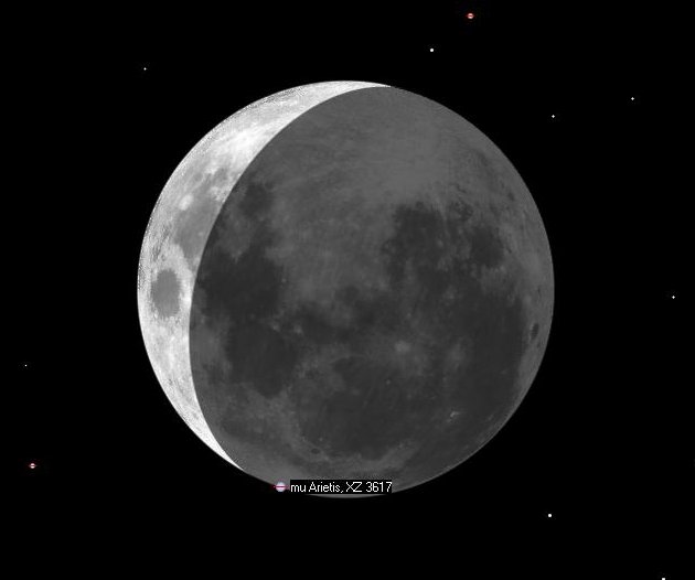 Tähti ZC 0399, myy Arietis (5,7 mag) sivuaa Kuun pohjoista reunaa Pietarsaaren ja