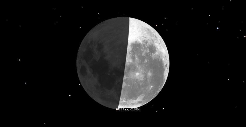 Tähti ZC 0714 (95 Tauri, 6,2 mag) sivuaa Kuun pohjoista reunaa Käsivarren poikki
