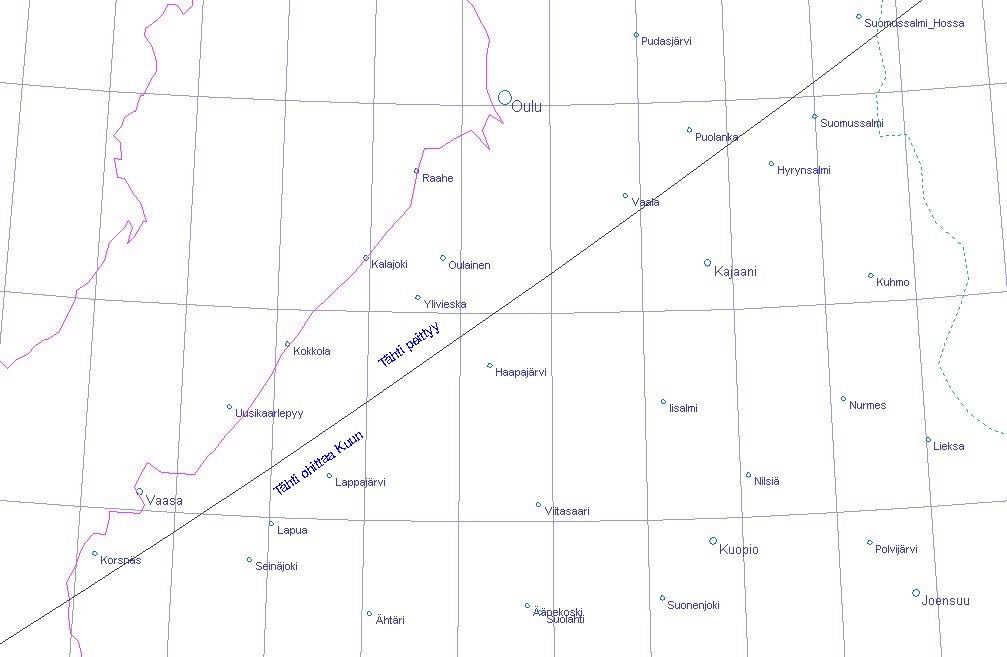 kohdalla. Viivan eteläpuolella tähti ohittaa Kuun. Kuun pohjoisnapa on kääntynyt