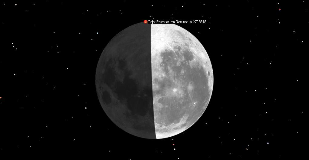 Tähti ZC 0976 (Tejat, myy Geminorum, 4,7 mag) sivuaa Kuun eteläistä