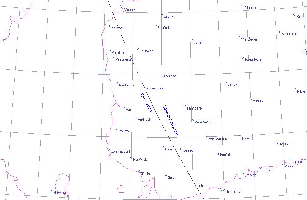lähistöllä kulkevan viivan kohdalla. Viivan itäpuolella tähti