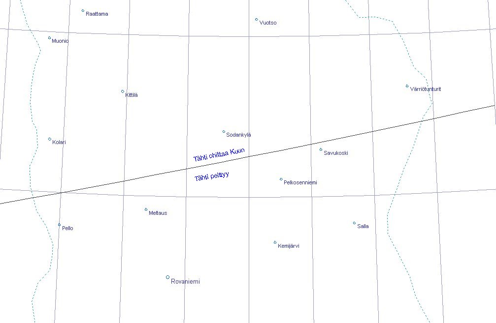 lähistöllä kulkevan viivan kohdalla. Viivan pohjoispuolella tähti