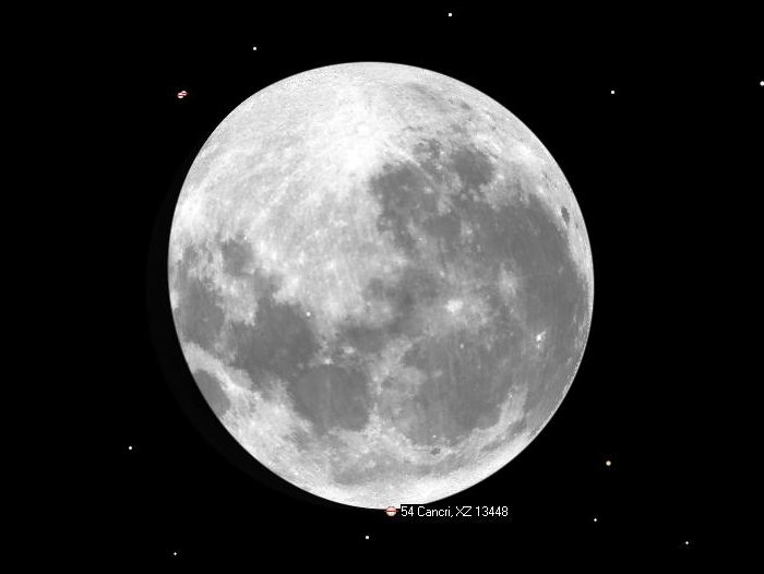 Tähti ZC 1323 (54 Cancri, 6,4 mag) sivuaa Kuun pohjoista reunaa Pellon ja Savukosken