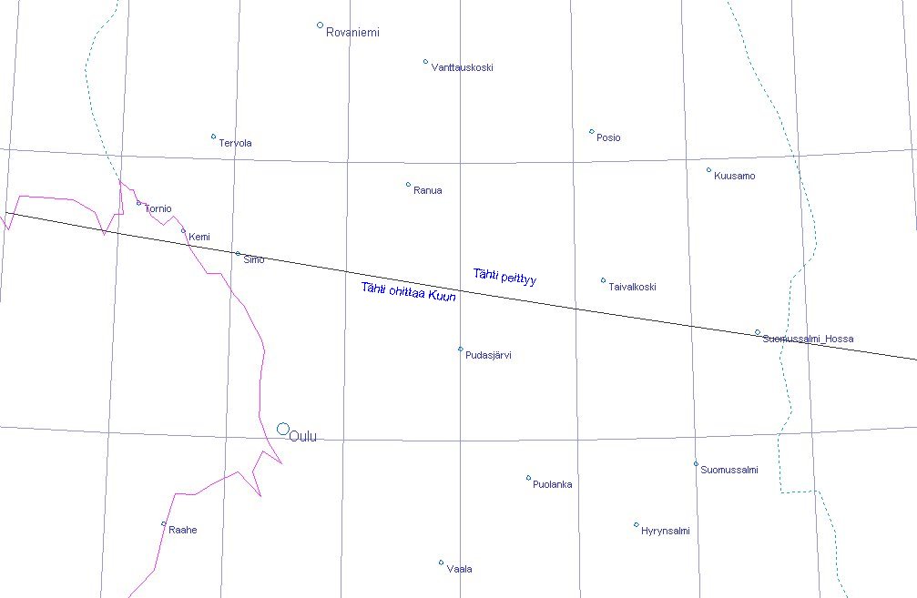 Tähti ZC 1566 (6,3 mag) sivuaa Kuun eteläistä reunaa Kemin ja Suomussalmen