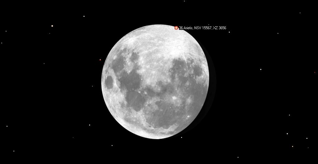 Tähti ZC 0402, 36 Arietis (6,4 mag) sivuaa Kuun eteläistä reunaa