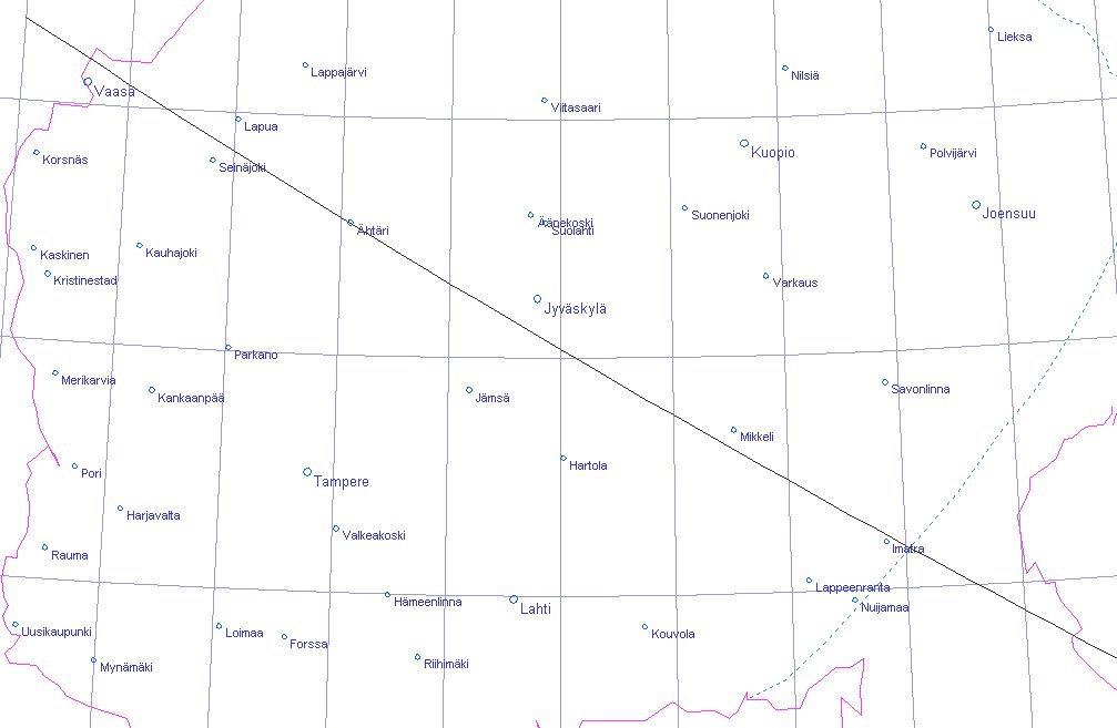 ja Imatran kautta kulkevan viivan kohdalla. Viivan eteläpuolella tähti ohittaa