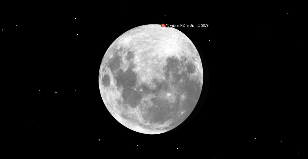 Tähti ZC 0432, 45 Arietis (5,8 mag) sivuaa Kuun eteläistä reunaa Mustasaaren