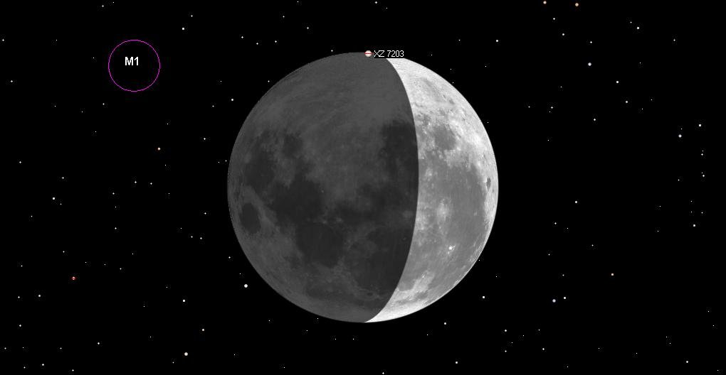 kulkevan viivan kohdalla. Viivan pohjoispuolella tähti ohittaa Kuun. Kuun pohjoisnapa