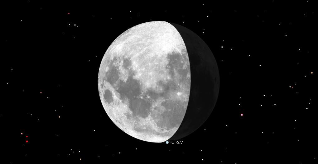 Tähti ZC 0859 (6,6 mag) sivuaa Kuun pohjoista reunaa Muonion Saitavaaran ja Kuhmon