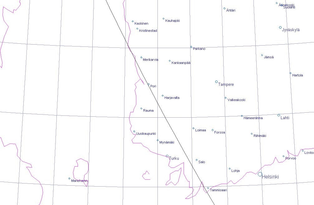 Raaseporin Tovon kautta kulkevan viivan kohdalla. Viivan pohjoispuolella tähti ohittaa