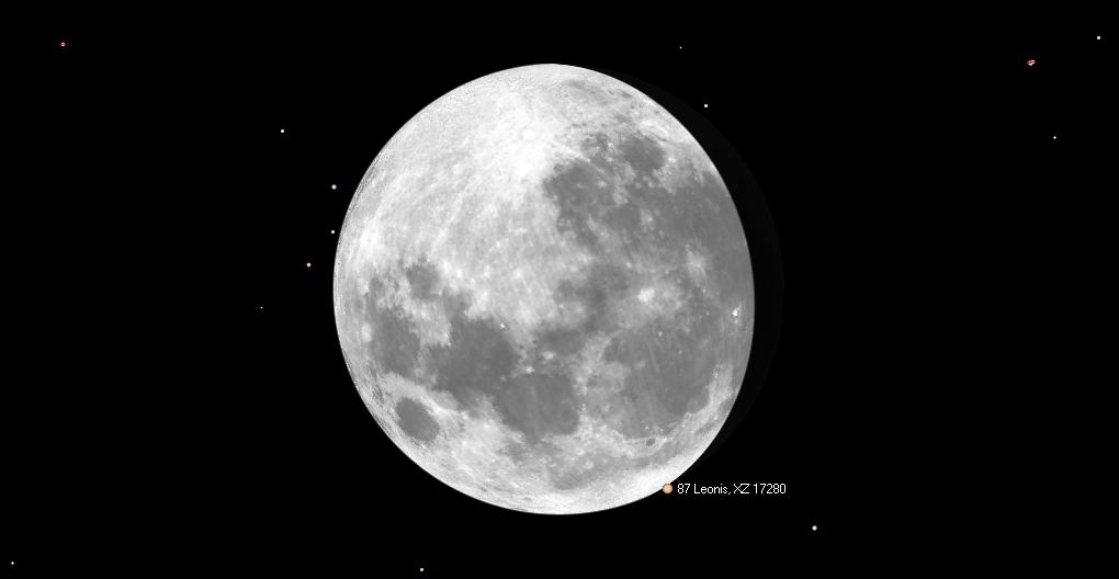 Tähti ZC 1670, 87 Leonis (4,8 mag) sivuaa Kuun pohjoista reunaa Porin Lampaluodon ja