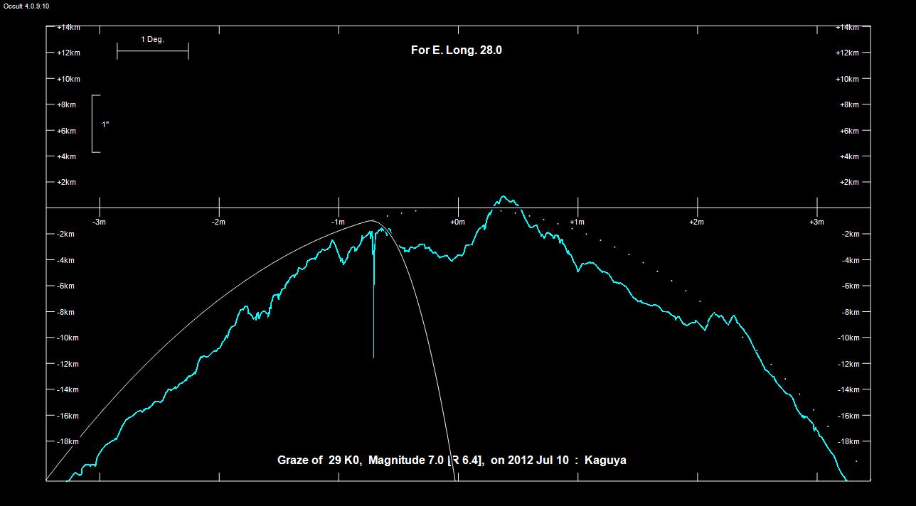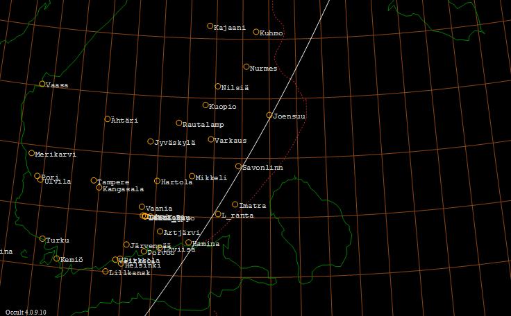 Tähti ZC 0029 (7,0 mag) sivuaa Kuun pohjoista reunaa Haapasaaren ja Lieksan kautta kulkevan viivan kohdalla.