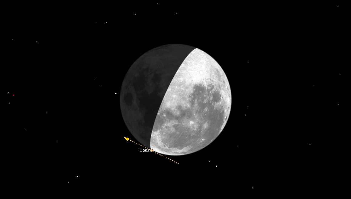 pimeän reunan puolella. Havaitsemiseen tarvittaneen 20 cm:n läpimittainen kaukoputki. Kuu on