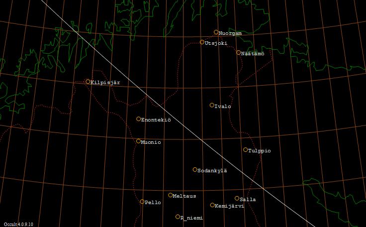 kulkevan viivan kohdalla. Viivan pohjoispuolella tähti ohittaa Kuun. Kuun pohjoisnapa