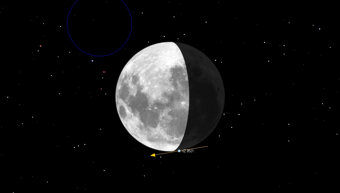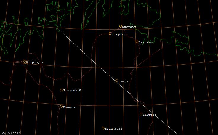 Tähti ZC 0935 (6,8 mag) sivuaa Kuun pohjoista reunaa Inarin kautta luoteesta kaakkoon kulkevan viivan kohdalla.