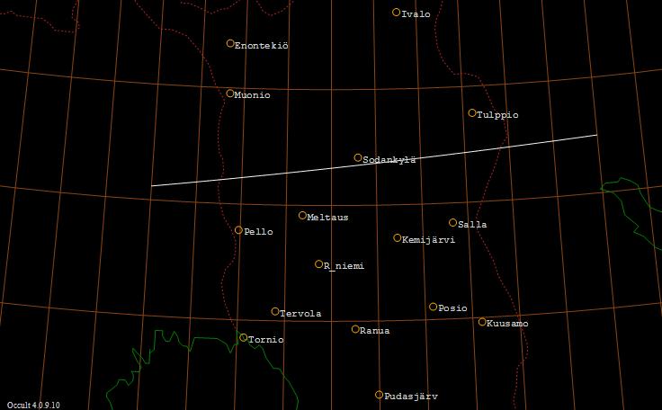 Tähti ZC 1281 (6,3 mag) sivuaa Kuun pohjoista reunaa Kolarin ja Savukosken kautta