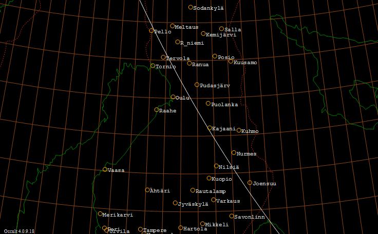 Tähti ZC 1551 (6,7 mag) sivuaa Kuun eteläistä reunaa Enontekiön Ailakkavaaran ja Joensuun kautta