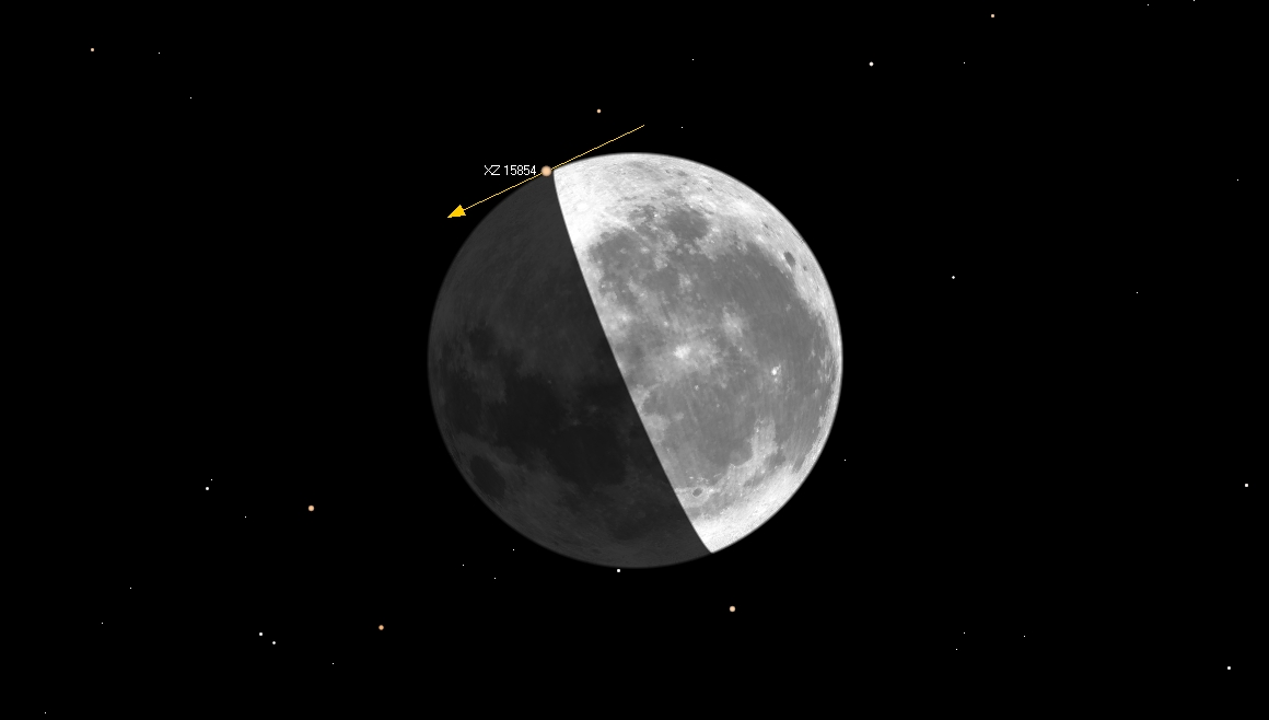 tapahtuu pimeän reunan puolella. Havaitsemiseen tarvittaneen 20 cm:n läpimittainen kaukoputki. Kuu on