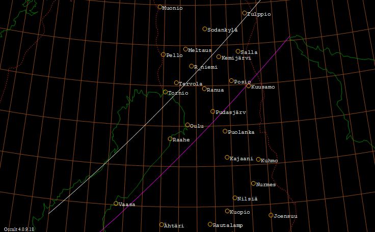 Jupiterin (-1,9 mag) pohjoisreuna sivuaa Kuun pohjoista reunaa Närpiön ja Kuusamon kautta kulkevan