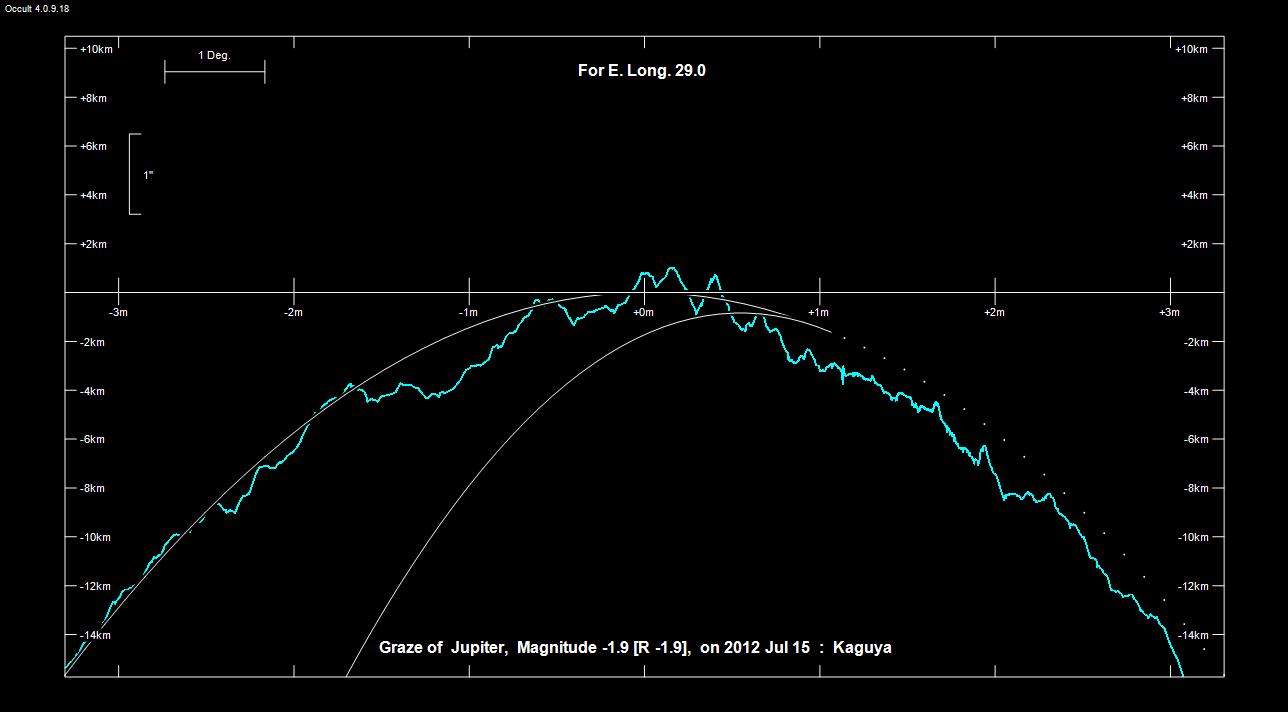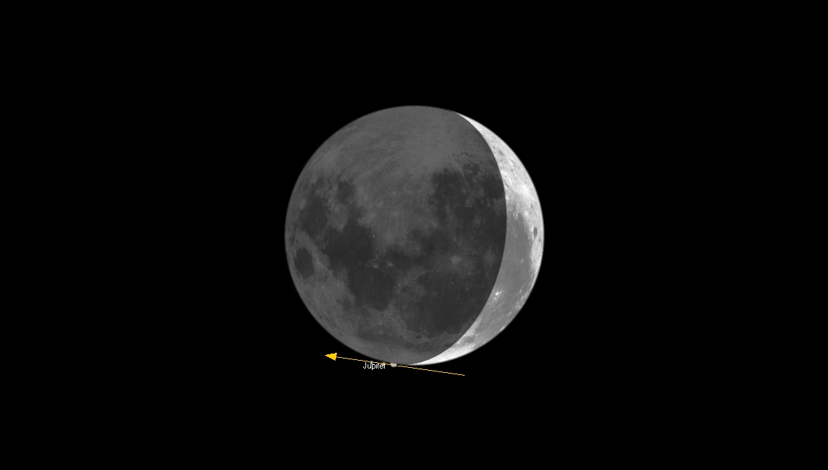 viivan kohdalla. Viivan pohjoispuolella Jupiter ohittaa Kuun. Jupiterin eteläreuna sivuaa Kuun pohjoista