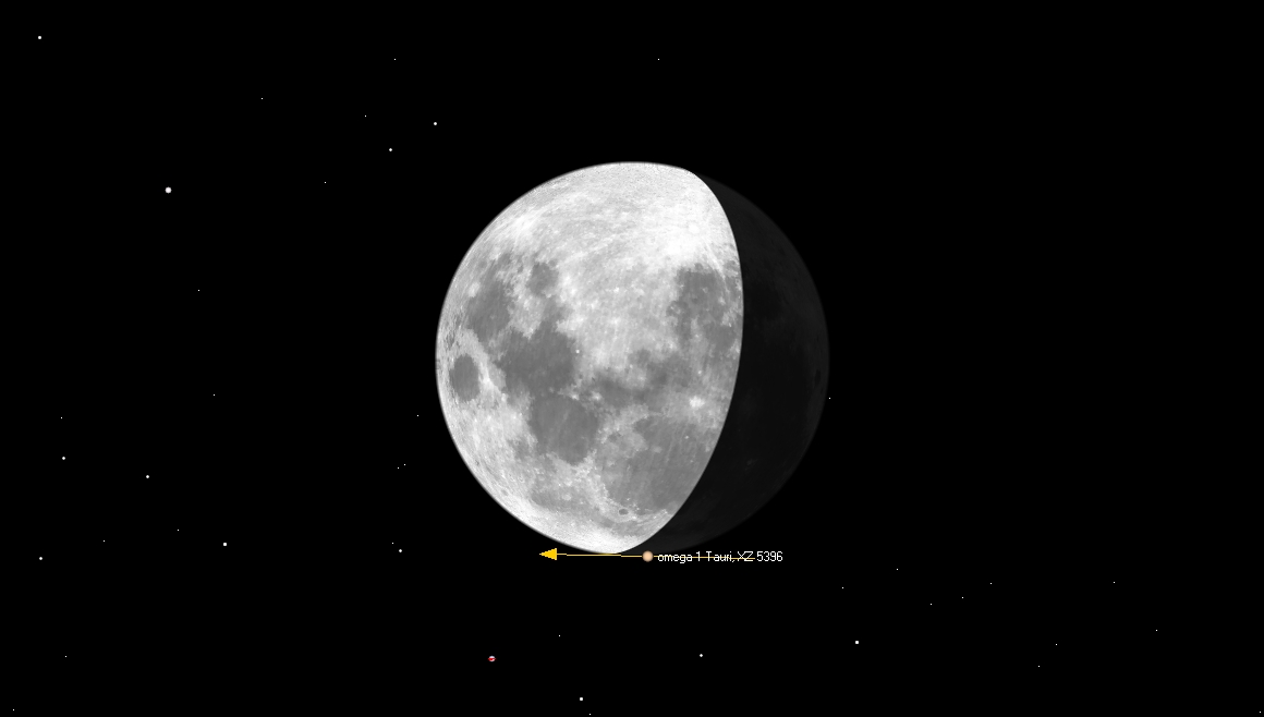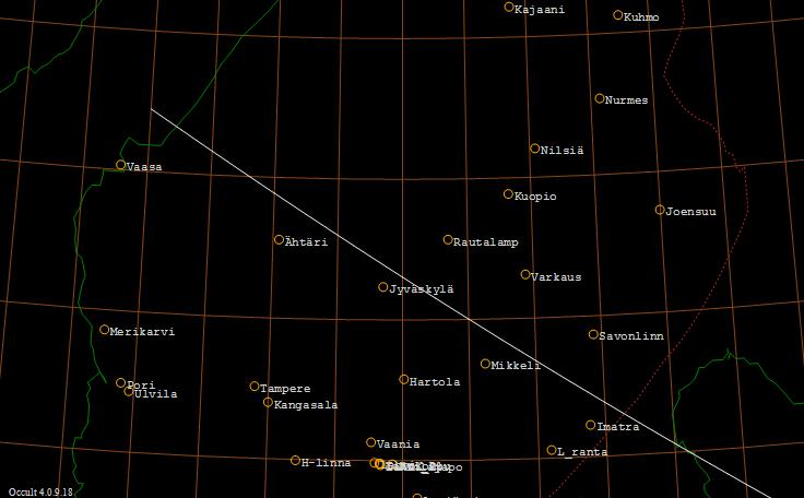 Tähti ZC 0614 (omega 1 Tauri, 5,5 mag) sivuaa Kuun pohjoista reunaa Oravaisen ja Ruokolahden kautta