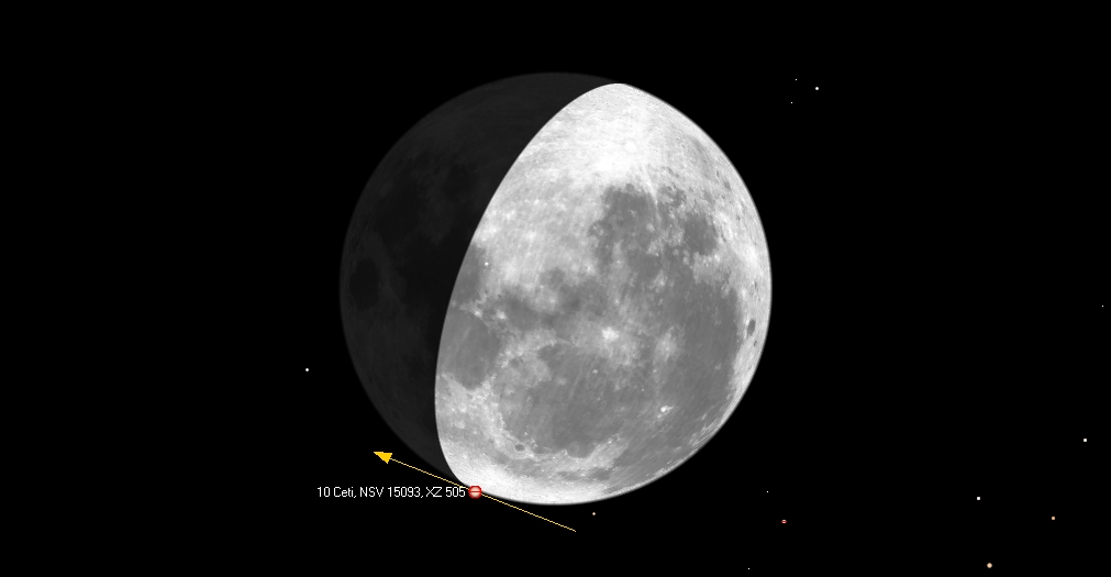 Tähti ZC 0055 (6,4 mag) sivuaa Kuun pohjoista reunaa Salon (pituus 23,1, leveys 60,4, etäisyys sivuamisviivaan
